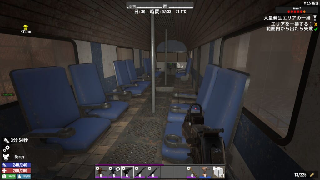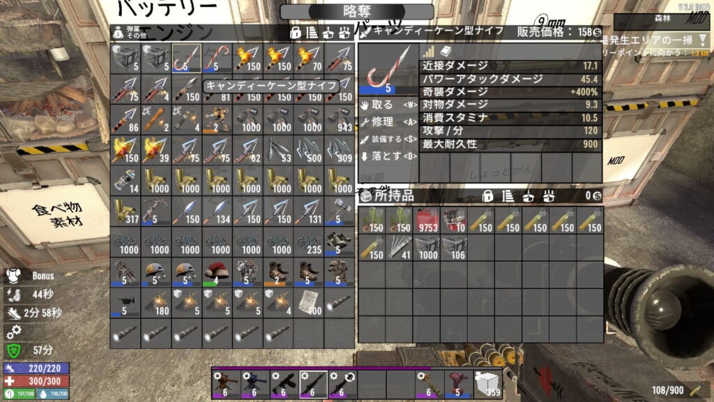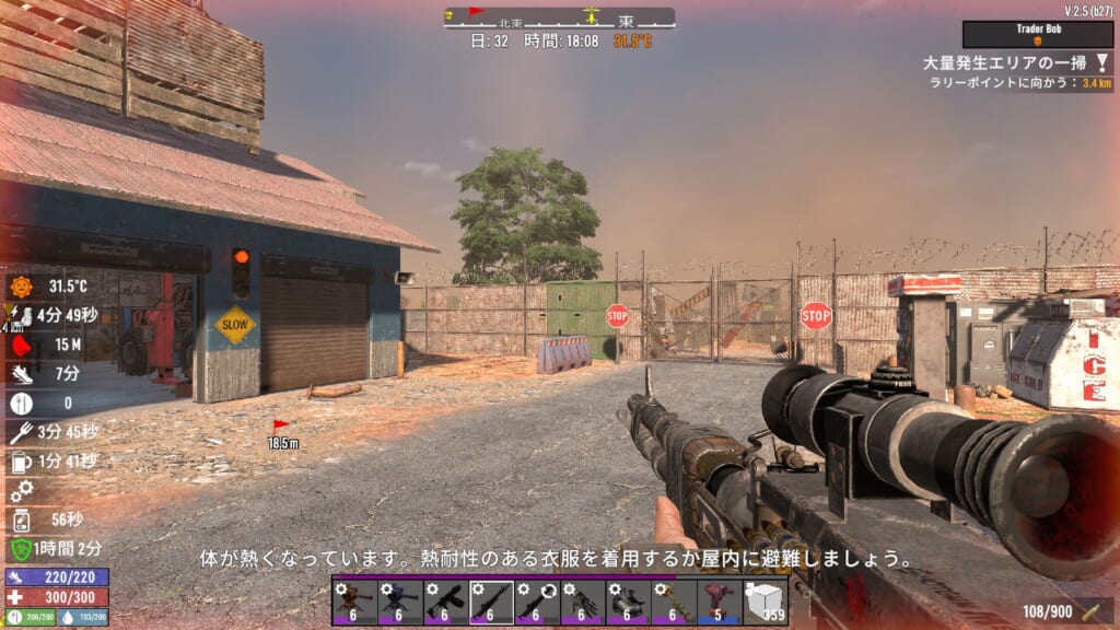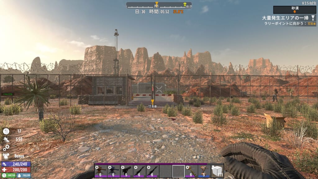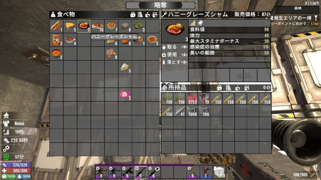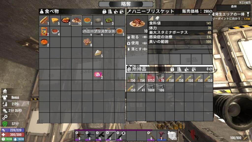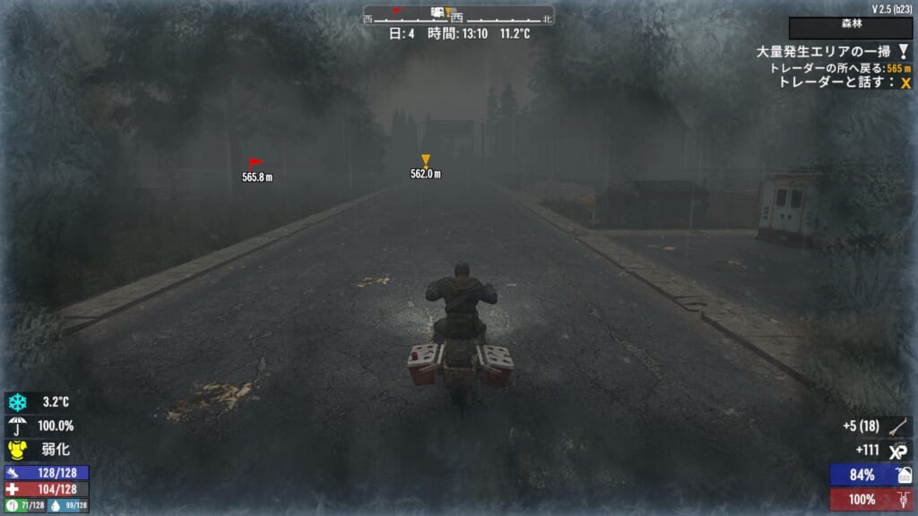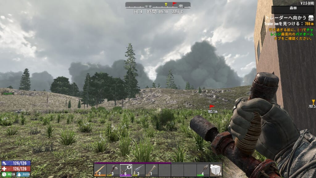 野生の動物を◯すと、◯した場所付近にゾンビが寄ってきやすくなる?ような仕様っぽいです。また、何か食べ物を食べると一定期間匂いが体に付き纏く模様です。これが結構強めの吸引力がありそうで、わりと遠くにいるゾンビもこちらに向かって走ってきたので、かなり検知範囲が広そうですね。
