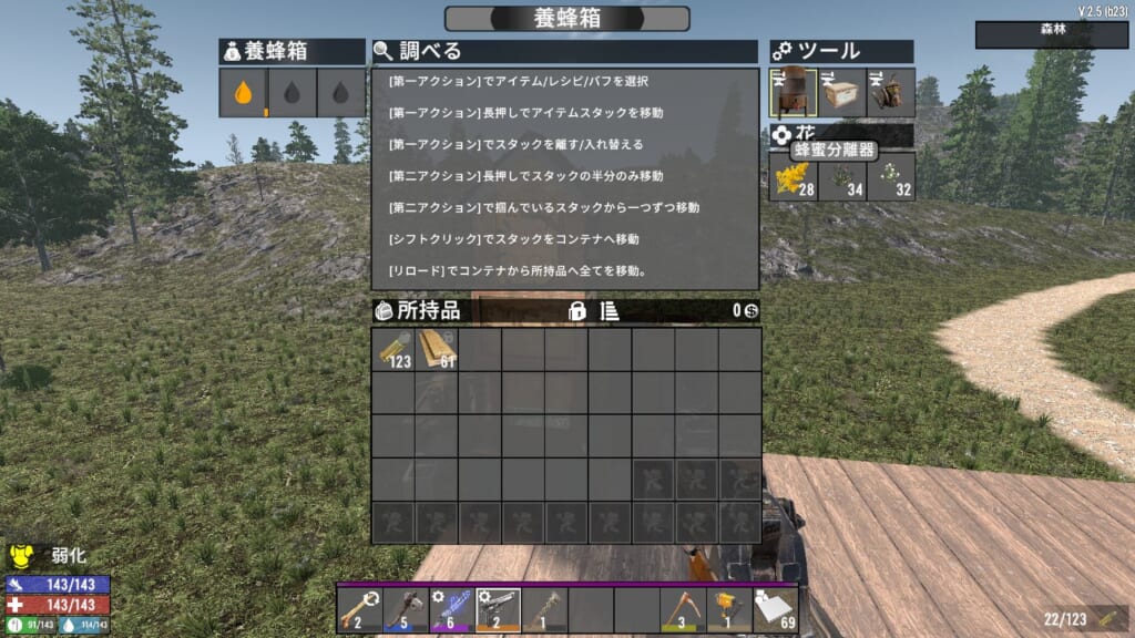 養蜂システムはクラフトしただけでは使用することはできず、菊やアキノキリンソウ、綿花のいずれかをストックしないといけないのですが、それが結構すぐ減る仕様で、かつ最低10個以上の量を入れないと蜂蜜を作ってくれないんで、本格的に養蜂したいなら花農園を整備した方が良いかも?