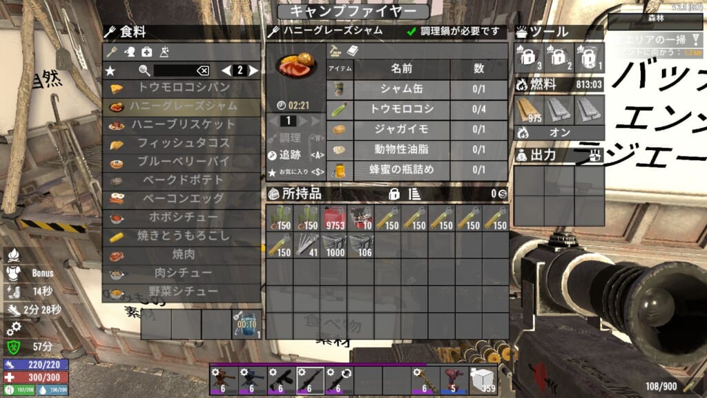 食材自体の入手難易度は軽めで、動物ハント&コーン&キノコ栽培で賄えるので、主食になりそう。